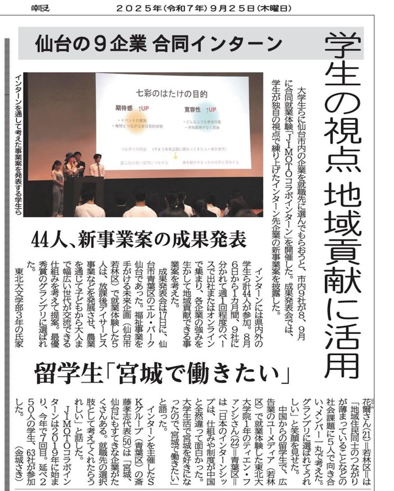 9月25日の河北新報朝刊にて、JIMOTOコラボインターン成果発表会の様子が掲載されました。ぜひご覧ください。▼河北新報オンライン 記事はこちらkahoku.news/articles/20250924khn000030.html(記事閲覧には無料もしくは有料の会員登録が必要になります)